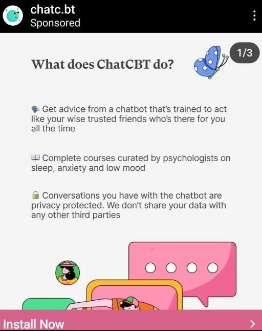 Tools like “ChatCBT” have entered the market, offering AI-based cognitive behavioral interventions. An AI program designed to implement CBT skills into your everyday problems.