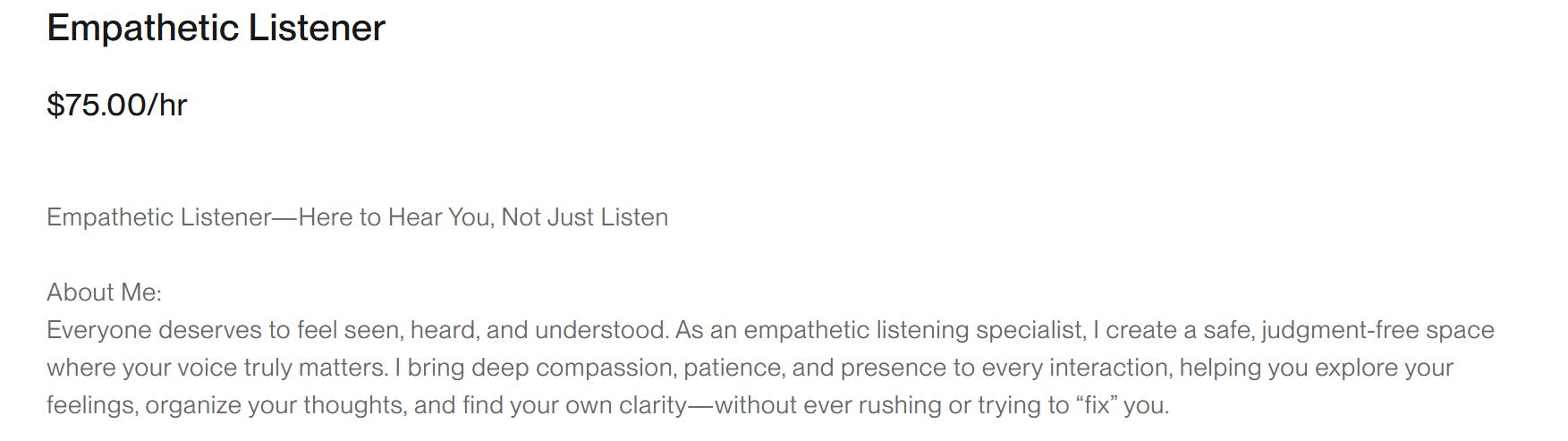 In the growing trend of outsourcing mental health care, we’re seeing the emergence of "empathic listeners,” a new role being marketed to the public as a substitute for therapists. Freelance websites like Upwork and Fiverr are flooded with listings for these positions, where individuals are paid to listen to others' problems without the training or ethical guidelines required of licensed professionals. The role is often framed as a "side hustle," reducing the complexity of mental health work to simply lending an ear while charging $50-100. This blurs the distinction between trained care providers and those with no formal expertise. This undermines the therapeutic profession and diminishes the gravity of mental health care, which involves much more than just being a sounding board. Take a look at this video to see how "empathic listening" is being marketed to the masses: